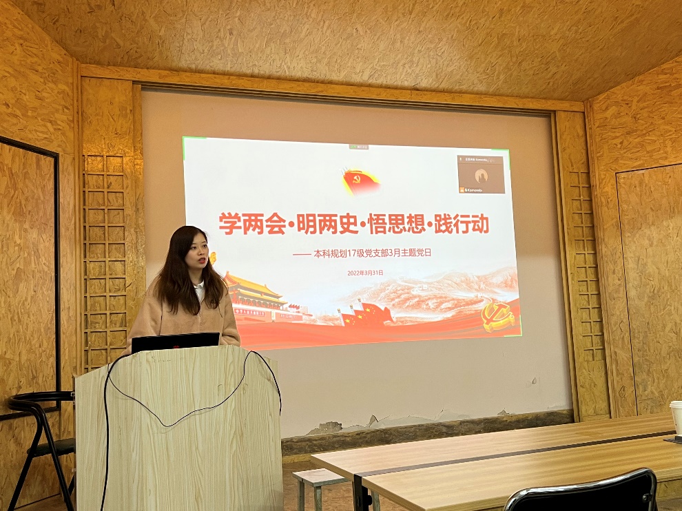 2022年3月31日,建规学院本科规划17级党支部3月主题党日活动在南四112教室顺利开展,本次主题党日邀请到了党建辅导员庞灿楠和校研究生红色讲学团成员韩天阳,会议由本科规划17级党支部书记陈银冰主持。