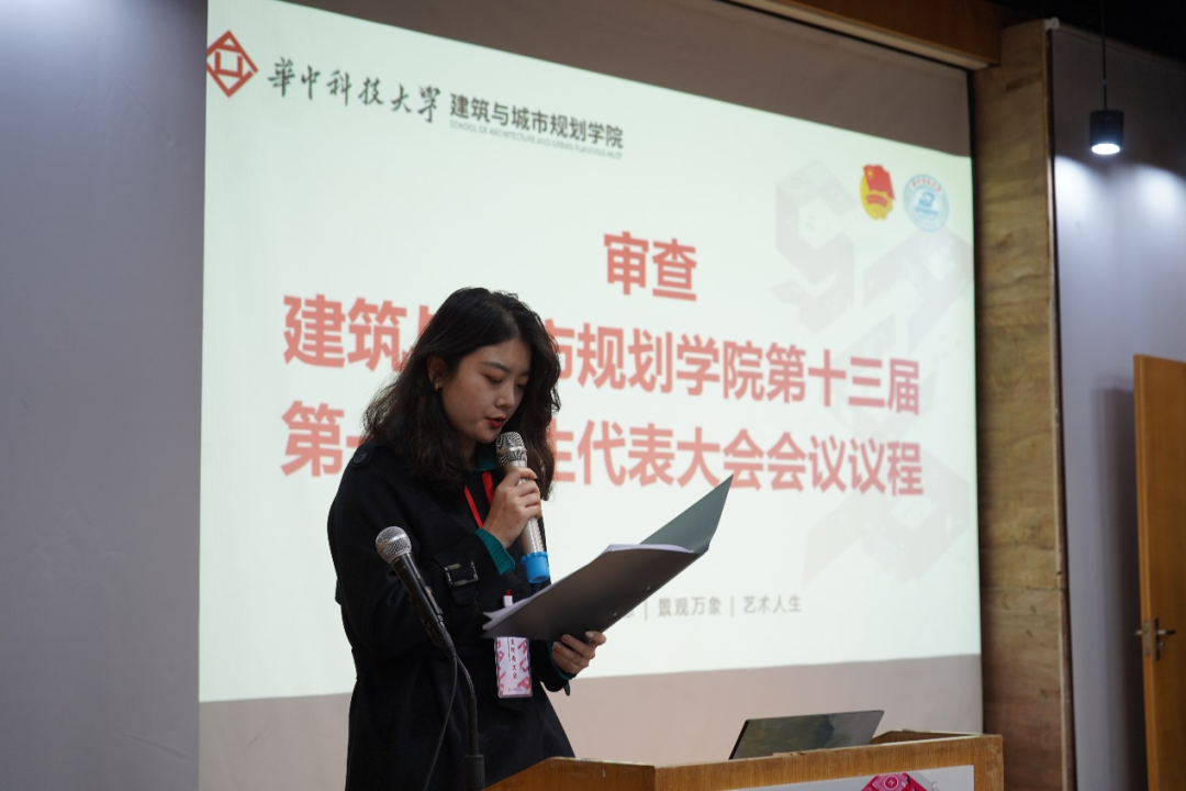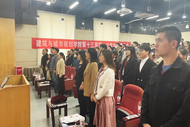接下来,大会正式开始。第一项,由主持人介绍莅临本次大会的领导和嘉宾。他们是:副院长彭翀老师、党委副书记何立群老师、建筑学系副系主任王振老师、城乡规划学系副系主任王智勇老师、景观学系副系主任殷利华老师、设计系党支部书记侯云鹏老师、设计学系副系主任王祖君老师、校团委梁栋老师、17级辅导员兼学工组组长杨柳老师、18级辅导员兼党建辅导员庞灿楠老师、19级辅导员兼团委辅导员赵爽老师、20级辅导员兼心理辅导员闫超老师、21级辅导员兼资助辅导员叶少华老师、校学生会主席团成员代表和院系主席团成员。