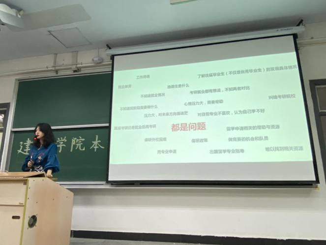 第三部分,赵爽老师为大家分析了毕业去向及规划。她以从同学中收集来的问题作为引入,将这些问题分类为两大共性问题:资源信息不全、自身认知不足,并且生动地为大家介绍了问题的解决方法。