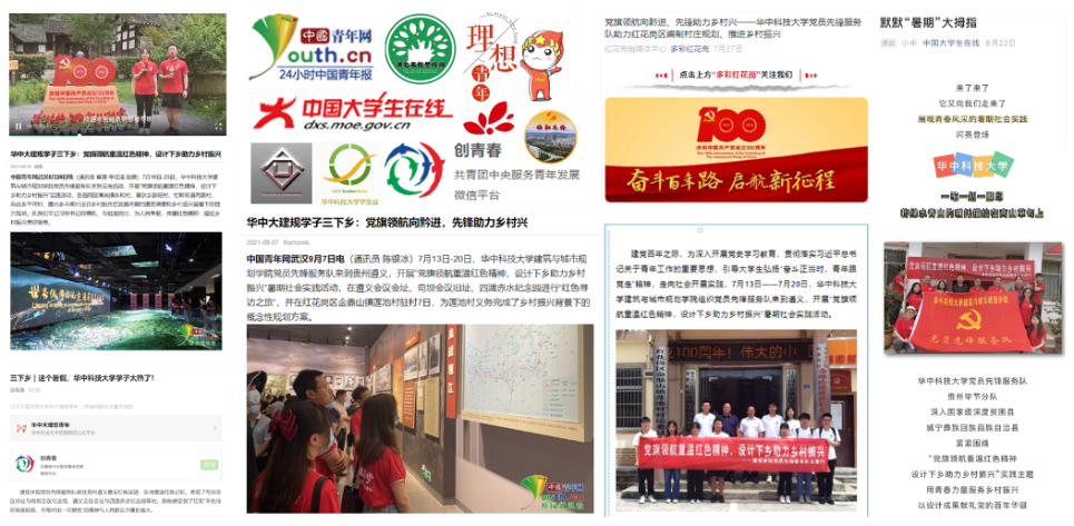 服务队的事迹受到了团中央官方网站中国青年网、教育部主导并推动的“中国大学生在线”微信公众号报道和地方各级宣传平台的推送总计20余篇报道,并荣登学习强国宣传平台、创青春官微,集中展现了我院社会实践团队深入乡村、扎根乡村、服务乡村的青春作为。