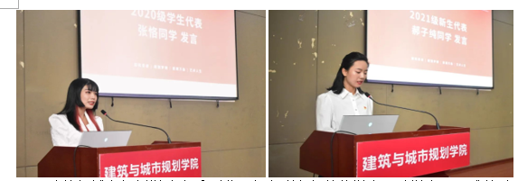 城市规划系2020级研究生张恪同学作为老生代表进行发言。张恪同学在发言中回顾了自己过去一年的学习及生活经历。她认为,华中大是一个圆梦的舞台,同学们将在建规学院拥有广袤的发展空间,希望大家以实现华中大梦为己任,用设计展现中国智慧,把论文写在祖国大地,将目光投在国际前沿,让建规人在更多缤纷的舞台上大放光芒。