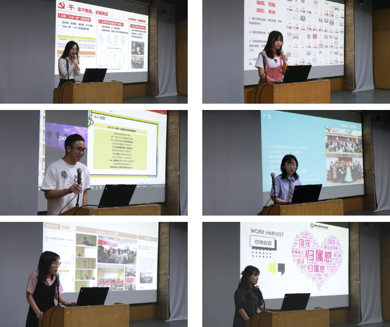 党务部、新闻部、实践部、文体部、学术部、办公室负责人分别进行部门职能、日常工作、部门风采的介绍。其中伍岳同学用一段rap进行部门的介绍,引得在场同学们的掌声连连。
