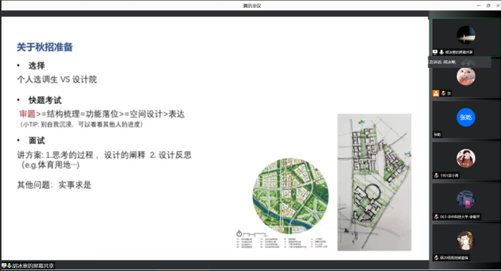 胡冰寒就毕业生们关心的设计院加班强度、出差频率、压力来源、工作氛围和职业理想等问题进行解答,并且将设计院单位进行横向对比。关于秋招,她还介绍了设计院快题和面试备考的经验,同时,细腻的学姐也不忘分享了很多她工作后的小感触。