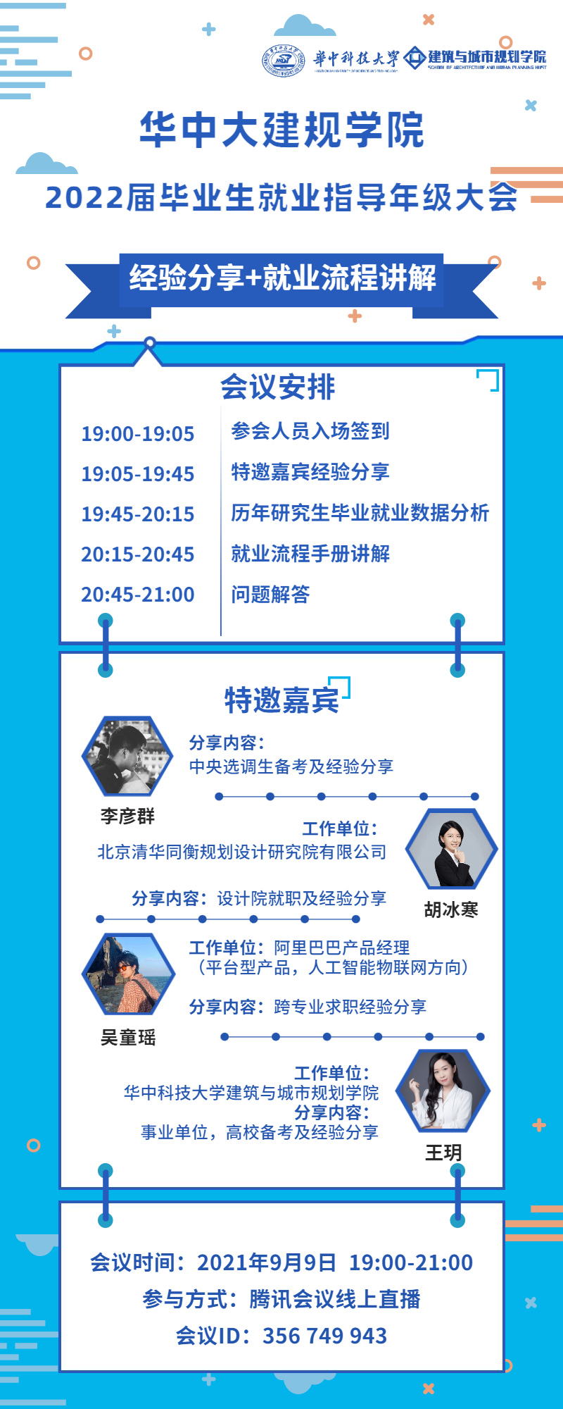 9月9日晚上7点,建规学院在线上举办了一次2022届研究生毕业生的就业指导大会。本次大会主要是为2022届毕业生求职就业扫盲支招,同时也鼓励研二及刚入学的研一新生参与学习,让学院各年级研究生们提前了解求职就业的相关问题,有意识地为今后“能就业,就好业”做充分的准备。