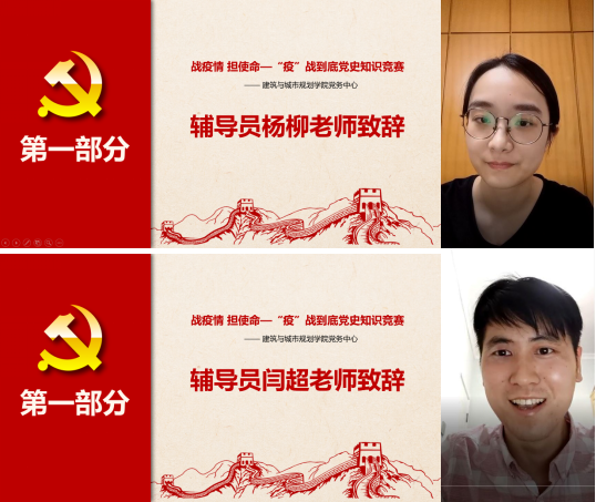 活动正式开始前,研究生辅导员杨柳老师首先为此次活动致辞,杨柳老师表示非常激动能在疫情期间采用这种特殊的方式参与党史知识竞赛,线上党史知识竞赛将会是一次有趣又有意义的尝试。在这样一个特殊的时代背景下,广大党员为答好这样一个时代命题,学好党史越发显得尤为重要,在时代大变局下,通过学习党章党史树立历史思维,能够更好的回顾昨天、把握今天、开创明天!最后杨柳老师线上为参赛同学加油助威;党建辅导员闫超老师在致辞当中首先对线上“云”党史知识竞赛的形式予以充分肯定,同时向大家分享了读《大国战“疫”:2020中国阻击新冠肺炎疫情进行中》一书的体会和感悟,提到书中内容和党史有很大的相关之处,书中所提到的中国力量、中国精神、中国速度和中国坚守,在中国共产党发展的每个阶段都能得到体现,包括此次抗“疫”过程中涌现出来的许许多多党员事迹,无不是中国力量、中国精神、中国速度和中国坚守的体现。最后,闫超老师希望各位党员同学能够从党史中挖掘属于自己的精神力量,支撑自己的人生之路,同时预祝活动圆满成功。