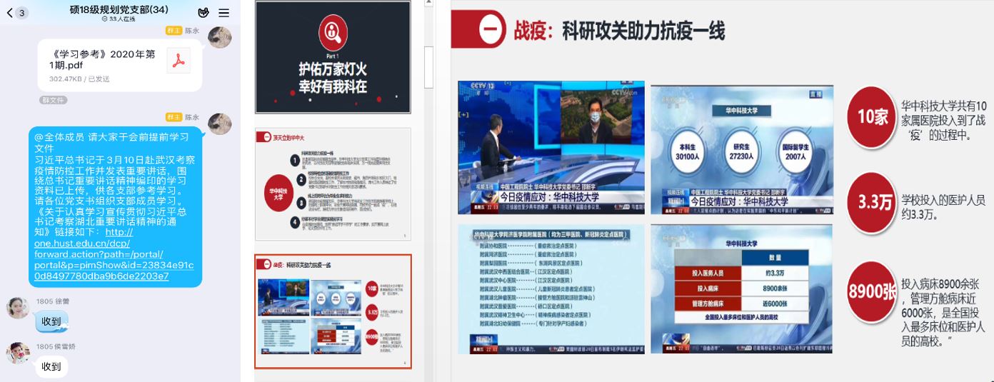 习近平总书记于3月10日赴武汉考察疫情防控工作并发表重要讲话,支部围绕总书记重要讲话精神,线上组织党员认真学习相关文件。同时支部党员肖婷以“护佑万家灯火,幸好有我科在”为主题讲授微党课,从四个方面:科研攻关助力抗疫一线、校领导检查校园疫情防控工作、线上招聘平台为毕业生求职助力、停课不停学云课堂实现云学习等讲述了华科大战“疫”故事。和大家一起梳理挖掘疫情防控过程中华科大涌现出的爱国先进典型感人事迹,让支部党员深刻感悟新时代爱国主义和爱校自豪感。