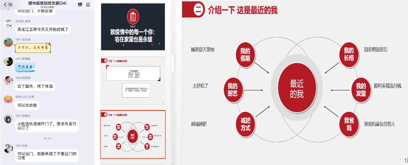 当前,新型冠状病毒肺炎疫情的防控工作正处于关键阶段,举国上下、万众一心、奋力抗疫,谱写了一曲曲感人的生命赞歌。为响应党中央的号召和学校党委的倡议,建规学院硕18级规划党支部于3月18日开展了线上党组织生活会,持续发挥党建引领作用,坚决打赢疫情防控战,同心战“疫”,爱国力行。