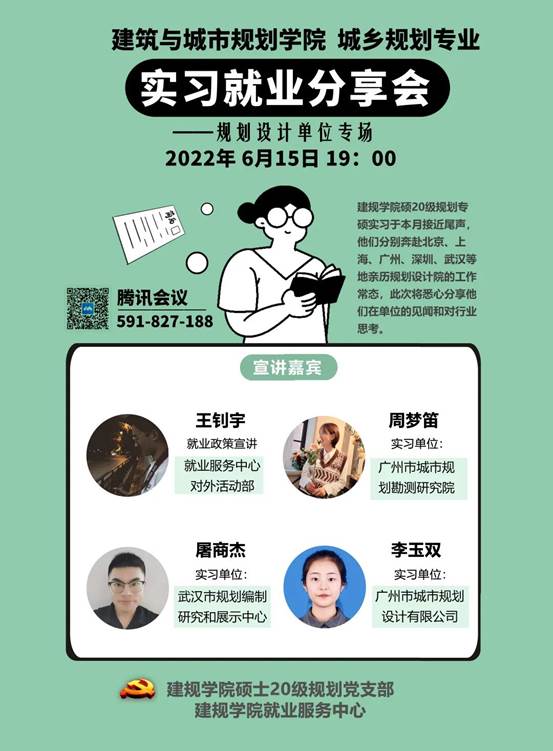 2022年6月16日晚,就业服务中心对外活动部“春招秋招那些事”宣讲活动与20级规划硕实习分享活动结合开展。本次活动由对外活动部负责人王钊宇进行就业政策宣讲,来自规划20级党支部的周梦笛、屠商杰与李玉双进行实习经历分享,给即将迎来秋招的20级规划硕的同学们答疑解惑。活动深入班级,聚焦同学们实习就业等问题,提出针对性解决方案。