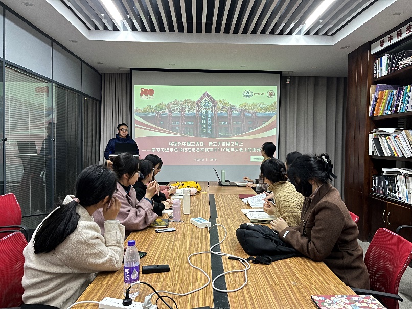 会议第一项,由特邀嘉宾研究生红色理论学讲团成员伍岳同志进行《将振兴中华之责任,置之于自身之肩——学习习近平总书记在纪念辛亥革命110周年大会上的讲话精神》的专题党课讲解。他从辛亥革命是历史的里程碑、中国共产党的历史使命、辛亥革命后的历史启示、祖国完全统一的历史任务四个方面进行讲授。