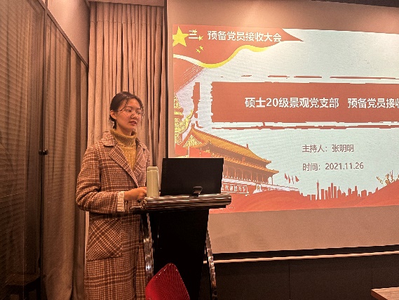 为进一步加强党组织建设,落实党支部发展党员工作计划。太阳集团网站8722硕士20级景观党支部于2021年11月26日晚7点在南四楼二楼中庭隆重召开了11月党组织生活会暨预备党员接收大会。会议由支部书记张明明同志主持,特邀嘉宾红色理论学讲团伍岳同志以及支部正式党员5人、党员发展对象2人、入党积极分子3人,参与了本次会议。