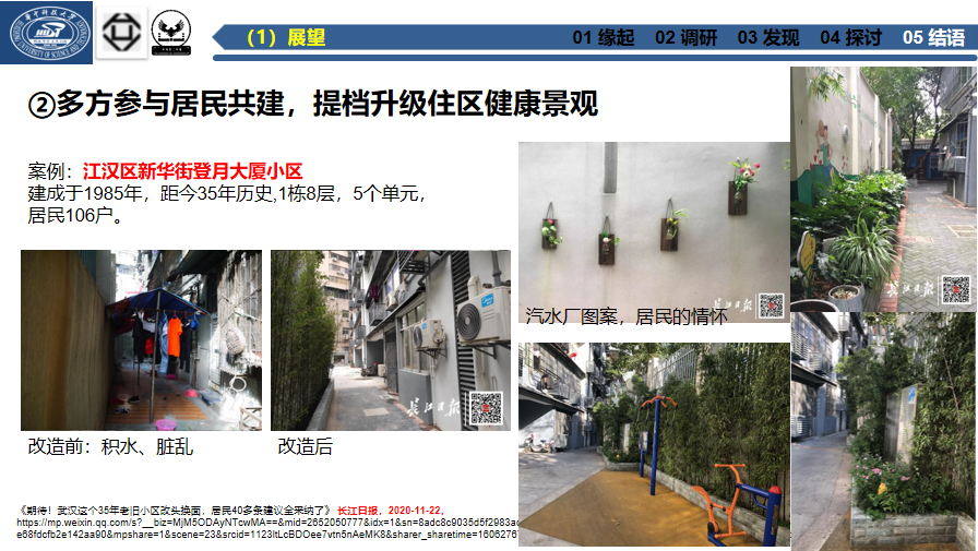 ①对住区健康景观的展望:全民健身休闲运动持续,住区健康景观细节处显关怀;多方参与居民共建,提档升级住区健康景观;关注全民健康,关照弱势群体,共建和谐住区;②对武汉、国家及世界安康的美好祝愿。