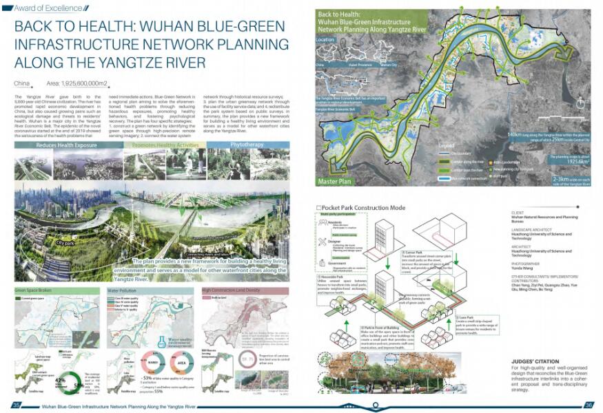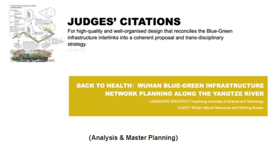 疫情期间,我院景观学系戴菲教授率领工作室硕博研究生团队,通过线上办公交流,组织参与了今年IFLA APR的项目报奖,并提交了一个作品“Back to health: Wuhan blue-green infrastructure network planning along the Yangtze River(重返健康:武汉市沿江蓝绿基础设施网络规划)”。近日IFLA主办方公布了获奖作品,该作品荣获分析与总体规划类的优秀奖,本次获奖是继去年获得荣誉奖基础上的再次突破。