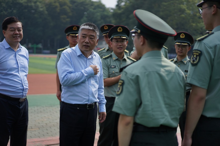伴随着小哨兵标准的军礼,梁校长等领导步入西操训练场,认真听取有关负责人介绍军训情况。随后,梁校长对军训辅导员和指战员及相关负责人做出批示,希望他们能够保持高度重视,加强学生军事训练管理,提高军事训练质量,提升学生国防意识、军事素养和综合素质。梁校长还对强化组织管理、统筹疫情防控、加强应急处置和营造良好氛围等方面予以指导建议。他特别强调,要将以人为本理念落到实处,将师生生命健康放在第一位,加强师生安全教育,增强师生预防和处置突发安全事件的意识和能力,增强承训官兵科学施训、文明施训和安全施训的意识和能力。在训练过程中,要注意观察学生身体状况,发现异常,及时停止训练并送医检查。对于突发状况要第一时间向军训工作领导小组报告,第一时间在军训工作领导小组指导下妥善处置。