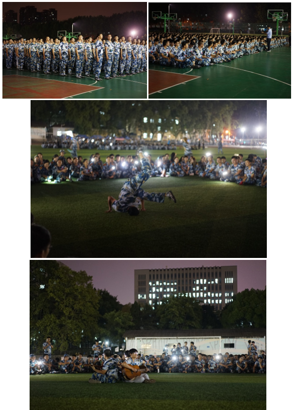 在军训中日益自信的同学们还进行了个人风采的展示。吉他、唱歌和街舞等活动,将军训文化氛围推向高潮。一片欢声笑语中,白天的疲累一扫而空,迷彩的身影如海潮般涌动,大学生活的美丽画卷正在展开……