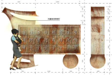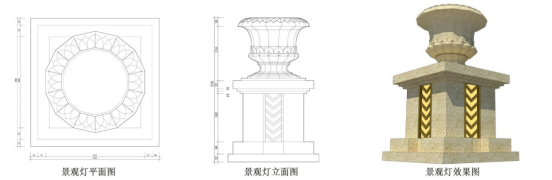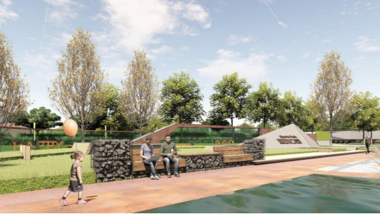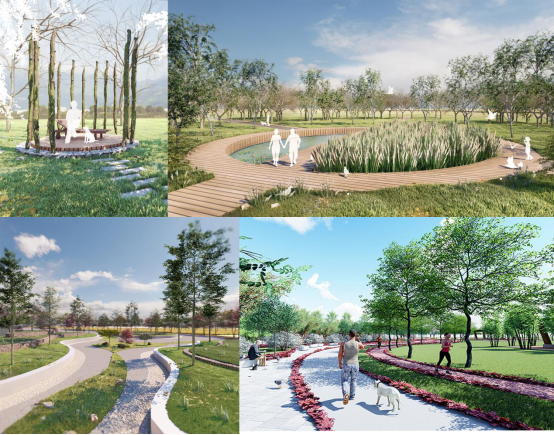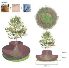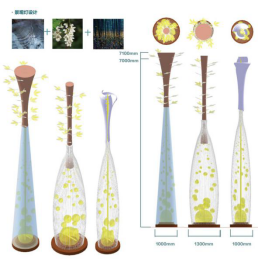 基地内文化感知设计主要从材料的运用和农业符号上来表达,树池设计借鉴了草编织的纹理,树木年轮的表现,并与植物生长相关联。景观灯的设计灵感来源于夜里田间萤火虫的回忆,伴随着槐花的香气,一起感受水流的潺潺温柔。基地内基于文化感知的设计主要表达出现代都市人回归田园生活的向往,从材料和造型表达上项游憩者传递静谧,温婉的情绪。