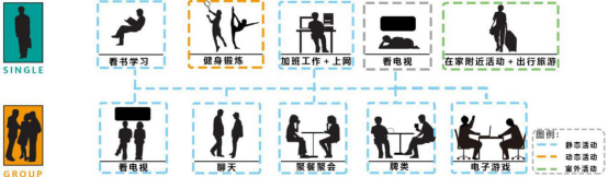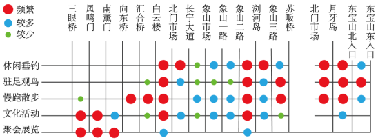 人文精神意象包含了非物质类的行为意象与感知性意象,是城市意象里的重要组成部分。根据作者对整个线性文化景观在不同时间的实地调查,总结出了如下图所示的行为意象分布及频率表,在结合了荆门的历史人文氛围基础上,在线性文化景观内确定并布局了各类人文精神意象的发生位置,设计能够提升该意象的空间或设施。