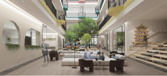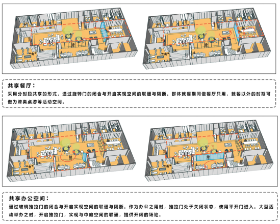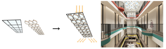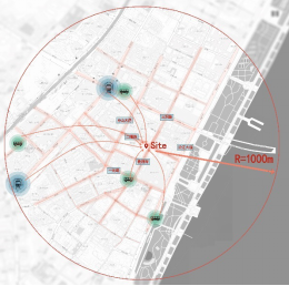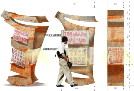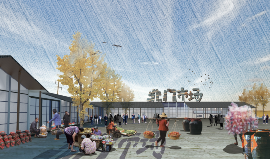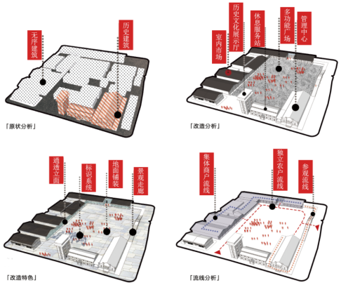 北门市场基地原有肌理混乱,功能繁杂,有许多空间浪费及空置的现象。本案首先将北门市场主要的物质意象:老式建筑结构与青石板路,与空间行为意象:集体商户、个体小贩、生活物资购买进行提取。在此基础上队北门市场的环境做出改善。将主要结构和历史文化建筑保留,让中央区域形成一个活动广场,提供商业、集散、休闲等多功能活动广场。该区域的改造特色为将棚户市场外立面设计为通透的玻璃结构,半开放式的外围部分与集市相呼应,增强体验感。从流线上看,设立三种流线为集体商户、独立农户、参观人群都提供独立的交通通道。