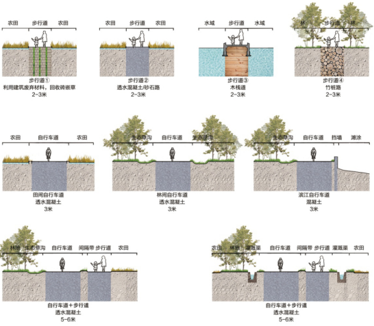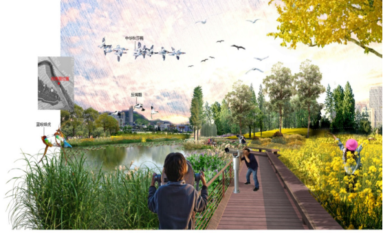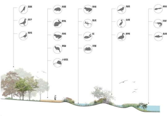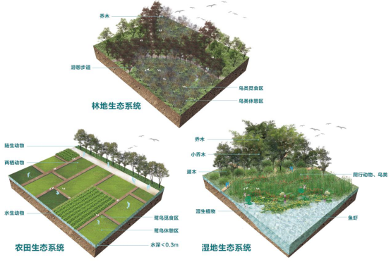 在进行林地生态系统设计时主要在林地的内部增加异质性斑块,强化边缘效应,优化植物群落层次,为动物提供食物,并逐步向自然森林演替;农田生态系统的设计是在水稻和菜地基质上增加其他有涵养土壤功能的植被斑块,增加林网强化与周边生境的联系;湿地生态系统在河流、坑塘和浅滩湿地,兼顾雨水收集与调蓄、灌溉、水质提升功能,并通过扩大水陆交错带、生态驳岸建设、增加岛屿等措施增大边缘效应,构建湿地植物群落,向自然演替过渡。