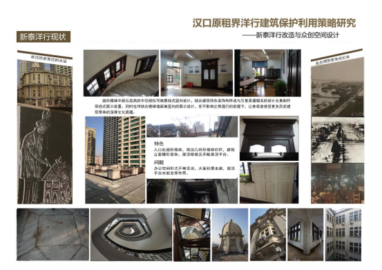 本次共有9组展示作品,包括:1)生态视角下的钢铁企业厂区环境设计、2)武汉警察博物馆室内外环境展示设计、3)汉口原俄租界李凡洛夫公馆保护与再利用设计、4)华商赛马公会历史建筑再利用设计、5)新泰洋行建筑改造与众创空间设计、6)共享理念下的青年公寓公共空间环境设计、7)武汉长江大桥光影秀设计、8)城市意象视角下的线性文化景观环境营造研究、9)都市农业理念在郊野公园游憩空间环境设计中的应用。