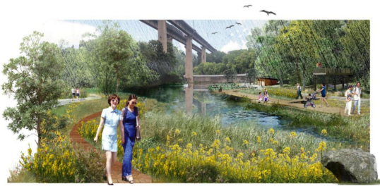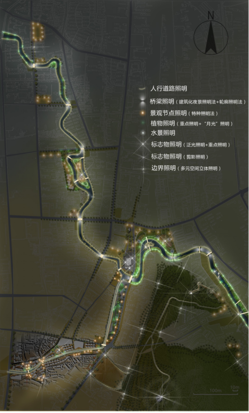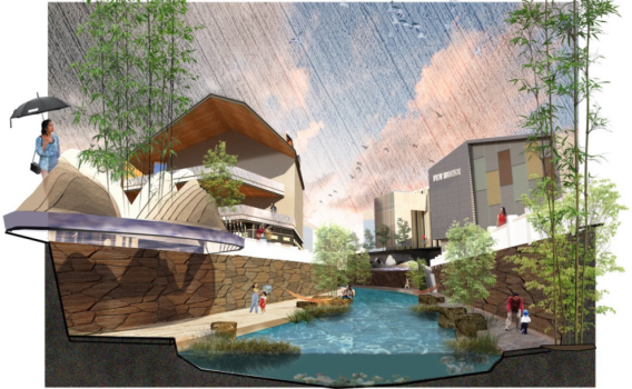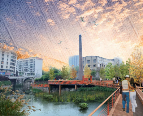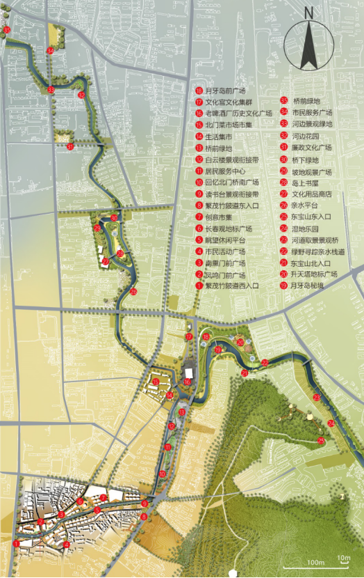串联竹皮河城区流域内的地标、节点、线性的道路、边界及面状的区域,凸显各元素之间相辅相成、交织缠绕、影响渗透的空间关系,搭建出有机统一的线性文化景观空间架构。并以竹皮河线性文化景观为核心纽带疏通荆门中心城区历史文脉与发展结构,激活荆门老城区人民对于竹皮河的认同感与自豪感。