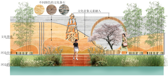 以竹皮河线性文化景观内的区域特色以及实际资源两个方面作为考量因素,将物质性意象合理适当的布置在景观内并重点强调。竹皮河南段与中段主要依靠其丰富历史文化建筑资源,强调各类历史建筑意象,打造文化小品意象,并根据该河段条件设计适宜的护岸与植物意象;东段则着重突出生态特色,将水意象、生态护岸、植物等作为亮点;北段为突出其与居民区结合的背景,利用护岸、文化小品、标识系统打造出丰富多样的使用环境。