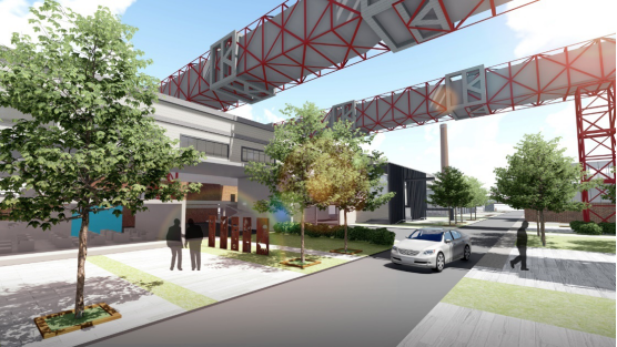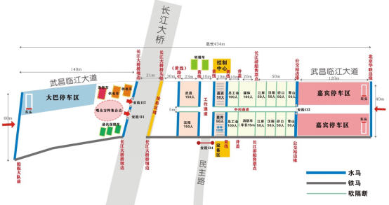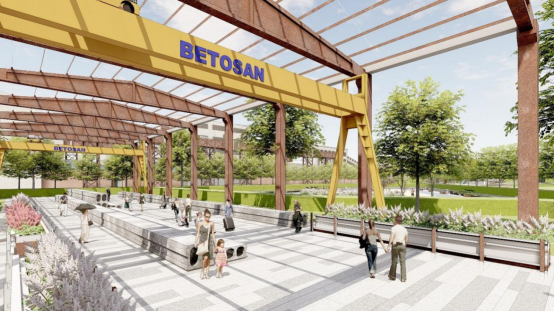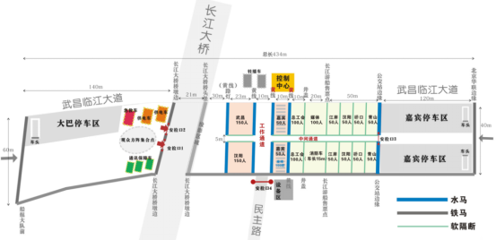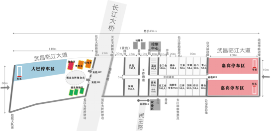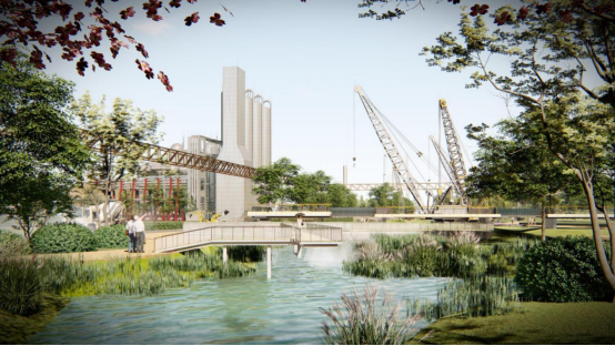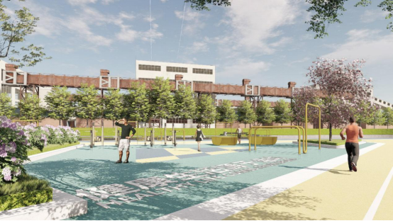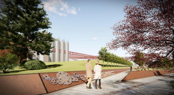 延续码头东西走向,设计景观广场。景观广场与企业入口形成呼应,成为对外展现的景观节点,广场为人们提供一个舒适的休闲公共空间。助沿江边坡高差,增设沿江观景桥,人们可以从不同角度和高度欣赏到长江两岸的自然风景,也可以欣赏到工业运输码头作业的全部流程和工业状态,景观桥的设计增加了码头区的竖向交通空间的变化。