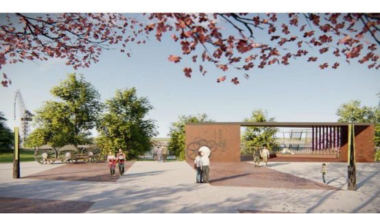 钢铁厂区内有较多的轧钢后未达到出厂标准的废弃钢材,这些钢材一部分是堆放在专有的废钢堆放厂,或者是再利用回炉煅烧,在厂区景观设计中可以利用这些废弃钢材在加工形成景观艺术小品。
