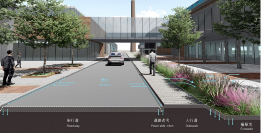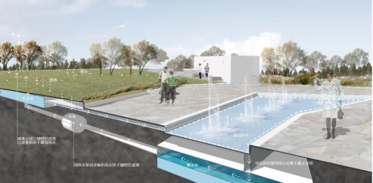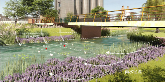 金盛兰钢铁厂雨水管理系统中引入低影响开发技术设施可以分为:雨水收集设施、雨水传导设施、雨水调蓄设施。雨水收集设施为:雨水下渗草坪,生态停车区域、透水铺装道路及广场;雨水传导设施为:生态植草沟,道路雨水边沟;雨水调蓄设施为:新长河生态河道、雨水花园