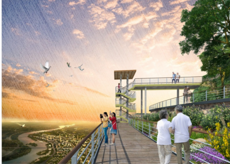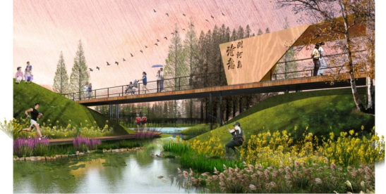 以“野趣月亮湾”的东宝山入口为例,在山体边界上设置可以俯览竹皮河河道的眺望点,一方面是用美学意象提升竹皮河线性文化景观;另一方面则是给使用者一个全新的视角观察每日所处的环境,唤起情感纽带的同时构建一个更加立体的新意象。