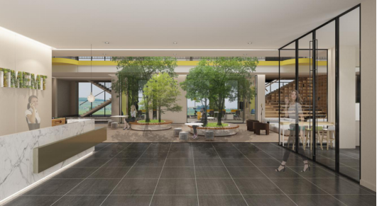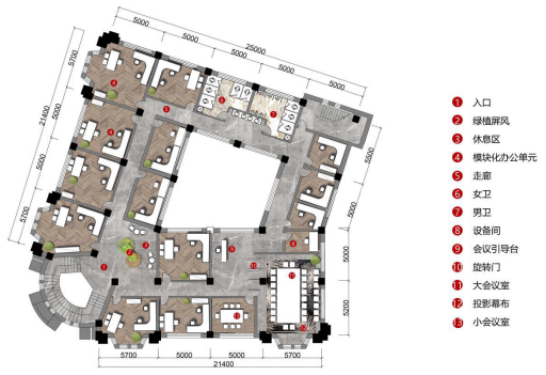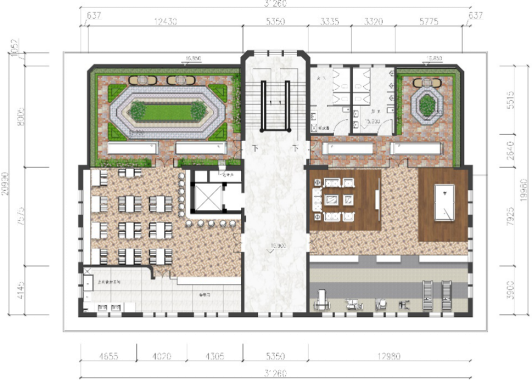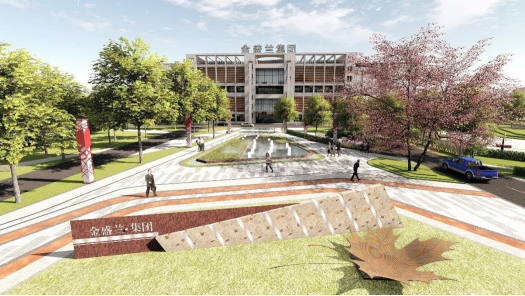 景观沿用建筑中心轴线,采用对称式景观设计。入口处设计昭示性的企业Logo牌,景观轴线上增加水景,增加入口仪式感和景观层次,轴线两侧设计地景式景观,硬质广场和绿化草坪相互呼应。
