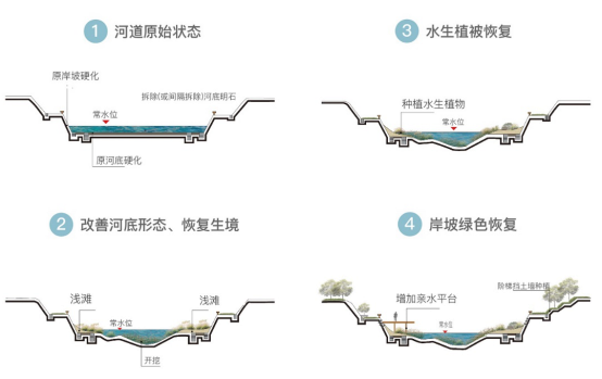 河道的生态修复不仅是对河道前期不合理的开发的补救,也是对后续补给河流资源的有利保障。恢复河道生态要从水质的恢复、驳岸的恢复、人工环境的恢复协同考虑。