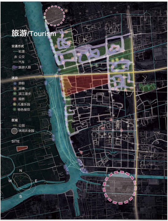上海市的旅游收入在全国排名中靠前,居民出游潜力大,人均GDP较高,旅游业整理发展趋势良好。上海旅游业形成了中心都市休闲,郊区生态度假的格局,但高等级景区中农业类最少。基地内存在较好的旅游资源,林地和农地能营造特色农业景观,滨江区域可以规划游憩步道,中型小镇可以改建为特色古镇街区,利用场地内的资源进行合理的规划,将价值发挥到最大。
