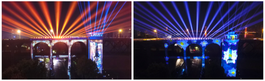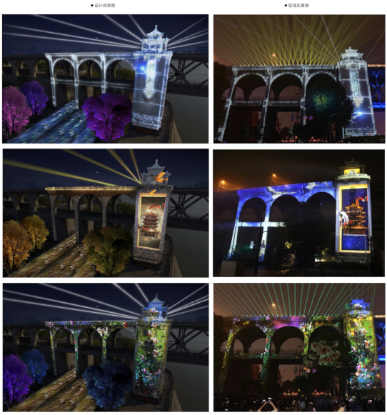 武汉长江大桥光影秀作为“长江灯光秀”的启幕秀演活动,于2019年4月30日晚20点顺利开演。整个长江大桥光影秀的策划、制作、施工周期接近3个月,期间多次对数字内容,光影秀方案进行了调整,通过光影秀当天现场图与前期设计效果图的对比可以发现,武汉长江大桥光影秀在视觉上基本实现了预期效果。