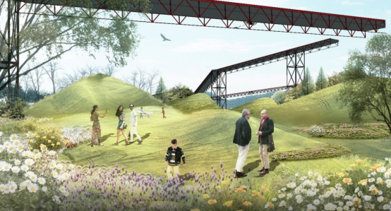 在厂区中主要存在两种弃土环境,第一种是工程弃土,就地堆积,弃土囤积在场地,可将弃土通过人工手段进行微地形的塑造,并配合挡墙,形成厂区内的人造景观环境。第二种弃土环境是未开发用地废土,主要集中在厂区周边,针对这种弃土环境可以运用自然式开发,结合原有地形起伏配合绿化种植打造成如连绵起伏群山一般的景观,并且可以共人们游憩玩耍。