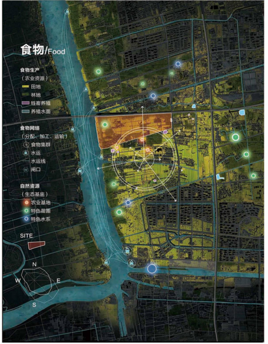 基地内有大面积的集中水稻田和临近村庄的菜地,农田肌理突出,形成局部特色农田景观。并且水网密布,有很高的水面率,地形地势总体走向较为平坦,平均高程为4.3。场地内生物多样性情况较好。因此在进行设计时应尽量保留原有农田肌理,改善基地内水源的污染情况,根据不同情况进行生态系统优化,以低影响开发为原则进行设计。