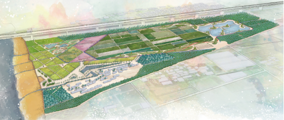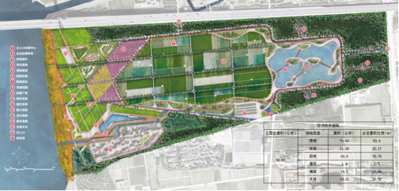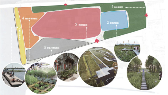 基地总面积为85公顷,其中水域面积约15.21公顷,农业用地面积约69.6公顷,林地面积约6.48公顷,建筑用地面积约1.4公顷,公园可承载游客容量为40万人次。按照不同的景观风貌将公园分为6个区域:林地风貌区、湿地风貌区、农田风貌区、特色农场风貌区、滨江林带风貌区、古镇人文风貌区。