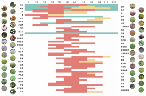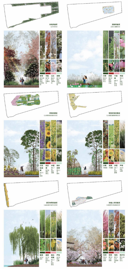 基地内的景观风貌主要以农田、林地和湿地为主,因此植物景观营造原则是在保护现有农田和林地植物的基础上,对生长不良、景观效果欠佳、相应的景观生态功能不能满足恶区域的进行修复和改造,并遵循乡土植物为主的原则,体现当地植物群落特征,增加教育功能,提升景观价值。通过采用乔木、灌木、草本和湿地植物的结合,形成多层次和多样性的群落形式,增加尤其环境的生动性和可参与性。在尊重自然的基础上充分利用植物的花、叶、果、种子、树干等观赏要素创造四季相宜的农业景观。