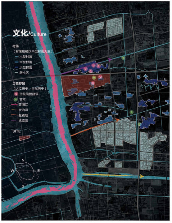 基地内文化内涵源远流长,整体建筑风格偏向江南建筑的白墙青瓦飞檐,土地资源的利用也以种植水稻为主,保留有特色建筑风貌和特色苗圃,可以挖掘其历史内涵,融入到场地设计中去。