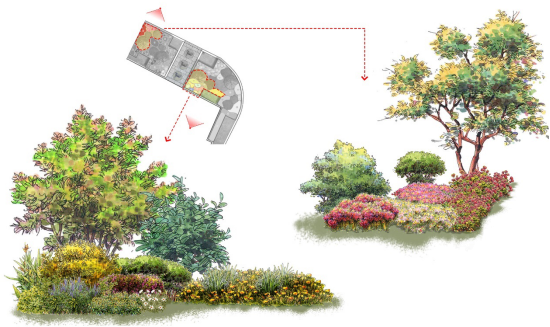 花镜是一种造景形式,以塑造多种花卉交错生长的自然型景观见长。本次花镜设计以观赏性与生态性为核心,结合汉口原德租界空间环境,历史建筑风格特征,希冀实现武汉警察博物馆室外空间、色彩、环境的有机协调。
