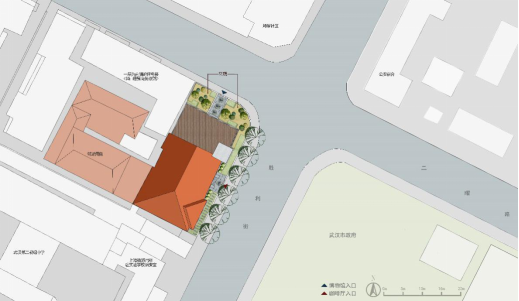 武汉警察博物馆根据室内功能划分,为展厅与咖啡厅分别设置入口。室外景观小环境设计也分为咖啡厅入口庭院与展厅入口庭院两部分。咖啡厅入口庭院以花镜设计为主体。展厅入口庭院以明朗风格为主体。