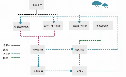 在厂区内设计整体的废水回收系统,生产以及生活用水通过管道收集到厂区内的原水处理站进行净化成为中水,净化后的中水通过管道可以作为厂区内植物的灌溉,或者再回用到生产用水和生活用水中。