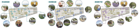 基地内主要设计了三个游憩路线规划,一是农业体验游,主要针对想体验农家田园生活的都市客群,游线以朴门农法参与体验项目为主,属于带住宿的深度度假游;二是休闲观光游,主要针对纯休闲观光的游客,游线项目偏重于娱乐观光、休闲购物与有机餐饮;三是家庭亲子游,主要针对以家庭为单位的客群,游线项目偏重于寓教于乐和全家游玩,融入部分农学农艺参与性活动。