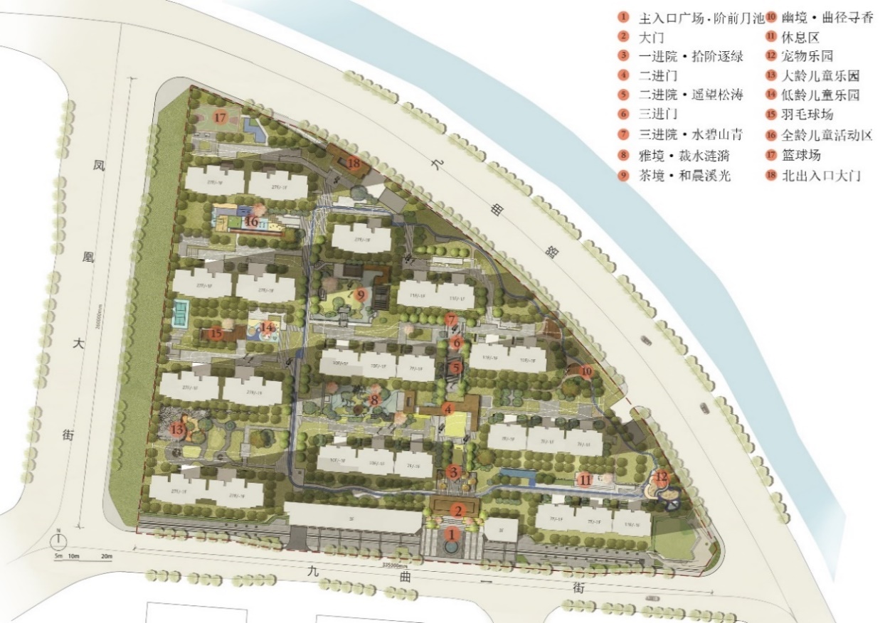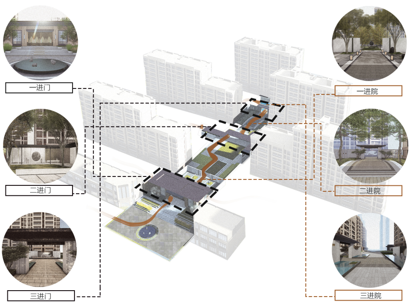 方案遵循为居民提供可居可观可玩的原则,诠释中国传统礼序,通过门厅礼序安排一主轴、三进院、五重境、八大景,营造归家礼序感。物镜、情境、意境,层层递进。