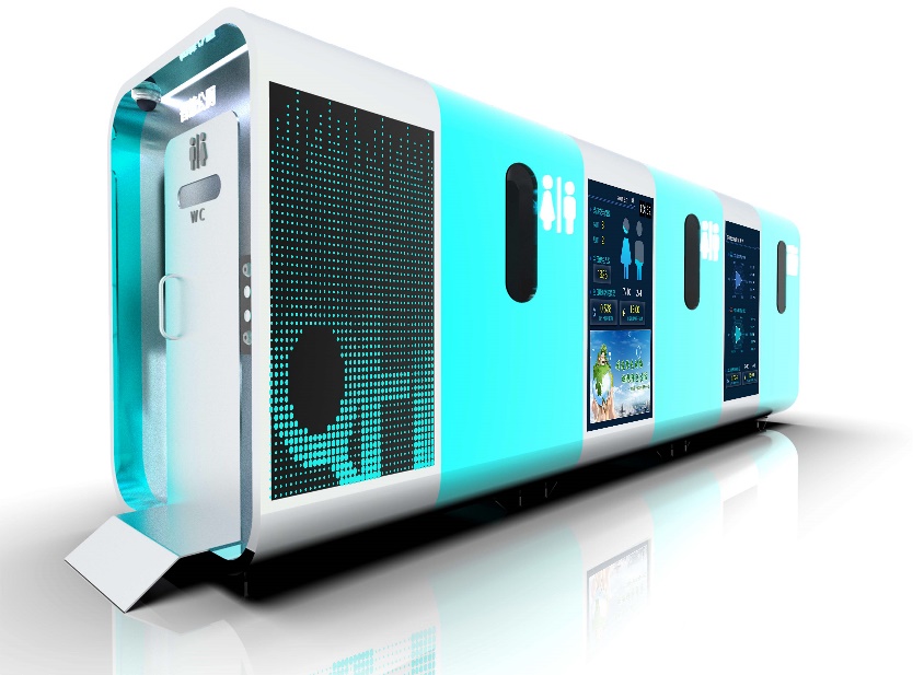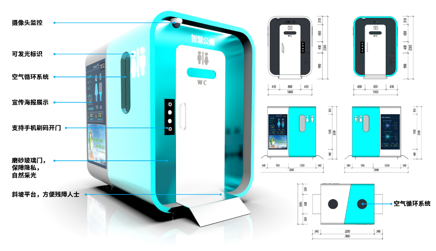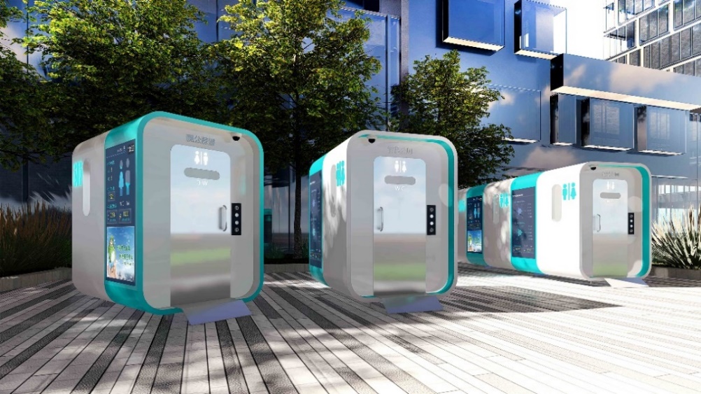 本次智慧移动公厕的设计是为了满足前海公共空间的使用需求,公厕采用单体使用与组合使用两种模块化使用模式,单体的移动公厕可同时满足两个人互不影响的使用,组合之后的移动公厕可以通过场地的实际使用面积增删单体厕所的数量,组合后的移动公厕在内部拥有更为充裕的使用空间,可满足多位使用者同时使用。侧面与顶面设有空气循环系统,在细节设计方面,公厕安装有智能传感器、摄像头、真空卫生系统以及智能门锁等技术。