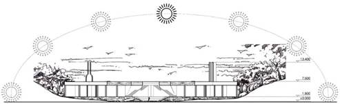 站在最高点的观景平台上能从东西两个方向一眼望穿整个天桥景观。同时,架高的走廊使该段区域的景观立体层次感更加丰富,登高空间的置入增强了人们的多维景观体验,同时在视觉上弱化了南侧垂直电梯的存在感,使其更好地融入景观环境中并成为景观表达的一部分。