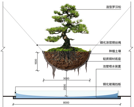 中心景观装置共分为两个部分:悬挂的景观组团以及地面的漩涡水池。悬挂景观组团底部为一个碗状轻型钢材浇筑而成的容器,外侧人为制造肌理并运用有机涂料仿制泥土块、树根等的造型及质感,内部填充土壤,顶部由造型优雅的罗汉松、球型灌木及景观置石等组成干净纯粹等景观小组团,并在容器周围设置挂钩连接在四周的塔楼立面,利用钢丝绳连接水管为植栽供水。