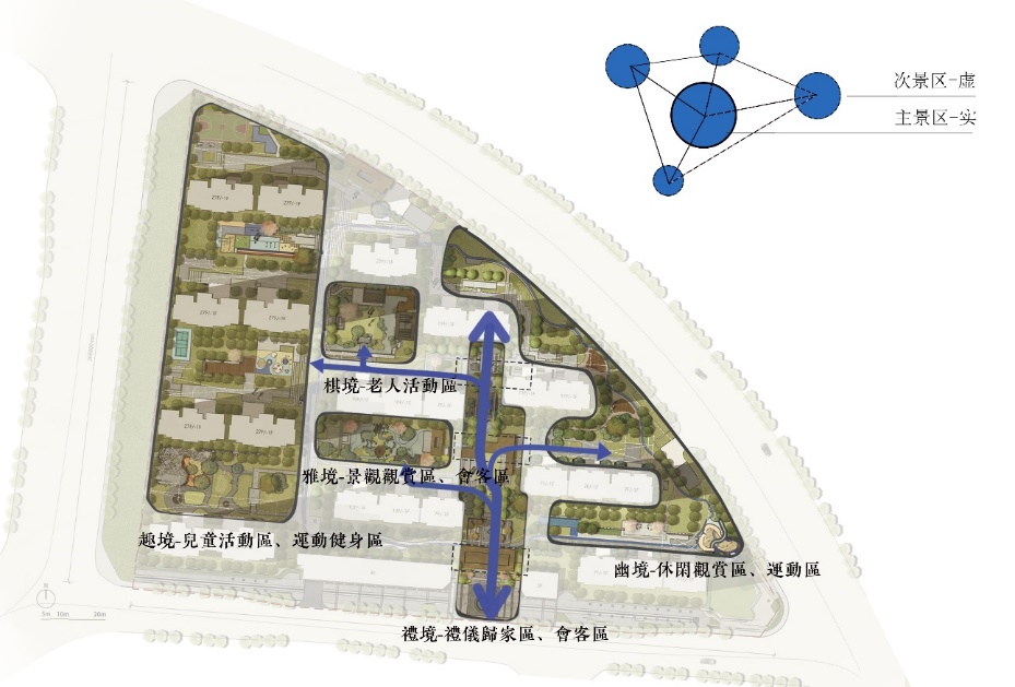 居住区景观面积较大,大景区需要区分为若干在整体布局中,景区有主有次,打造丰富的步移景逸的景色。溪望小区有一轴线三进院的中央主景区——礼境,还有其他次景区。次景区包括老人活动区棋境、社区会客厅雅境、儿童活动区趣境以及曲径通幽的幽静。