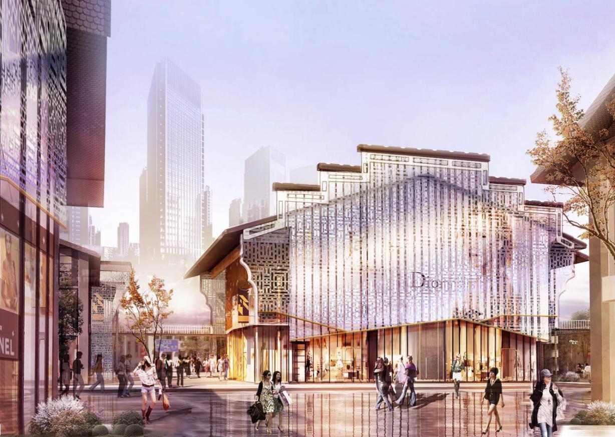 自由路街道整体风格为新中式风格,在设计中,选用了大量的木质材料,着重强调整体风格的特色。设计中最大的突破点在通过公共设施和文化墙来体现除文化的特色,采用的吊灯造型是通过户部巷片区自有的美食图案打造,不仅让整体街道充满了美食文化的氛围,加强了街区的活力,同时也成为自由路街道一道风景线。
