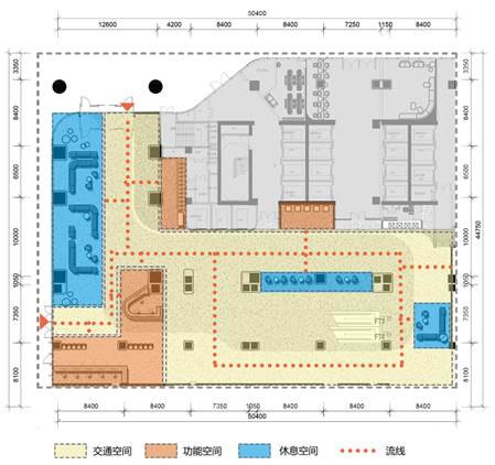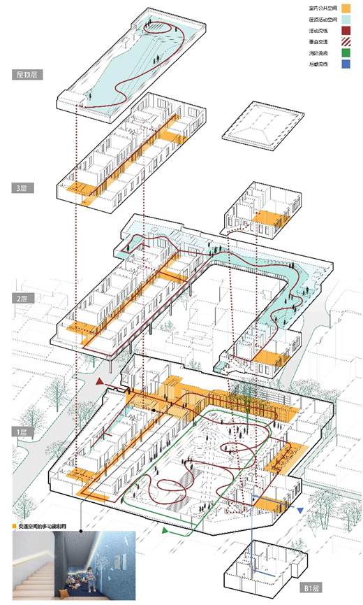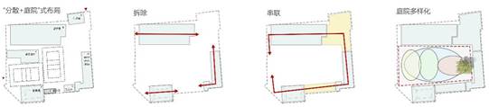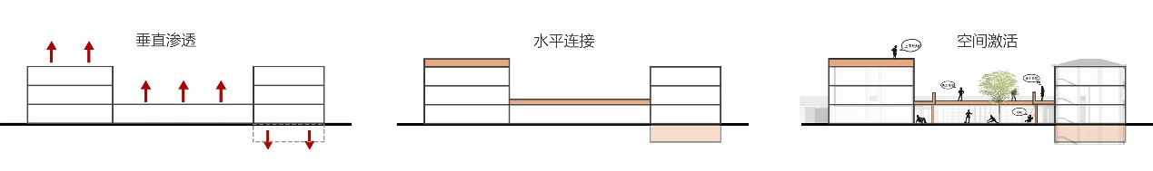 纵向布局上,对屋顶空间、棋院楼地下空间进行利用,垂直渗透。同时,通过扩建、接建手法进行连廊设计,使得建筑之间产生物质上关联,激活各种小空间,增加纵向空间丰富程度,活跃空间氛围。