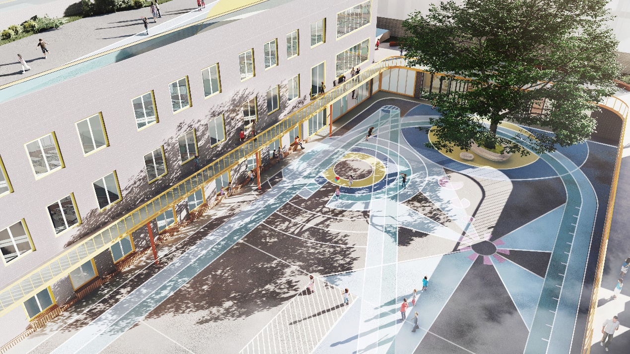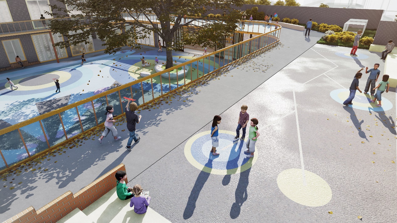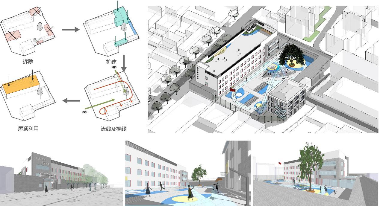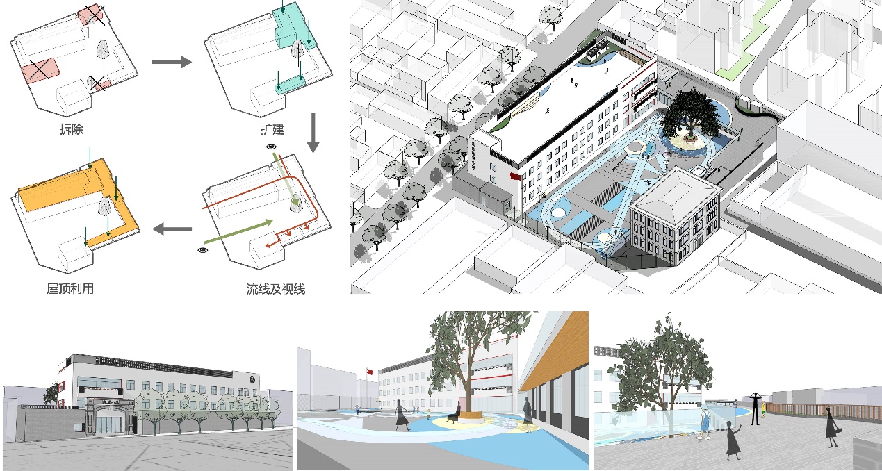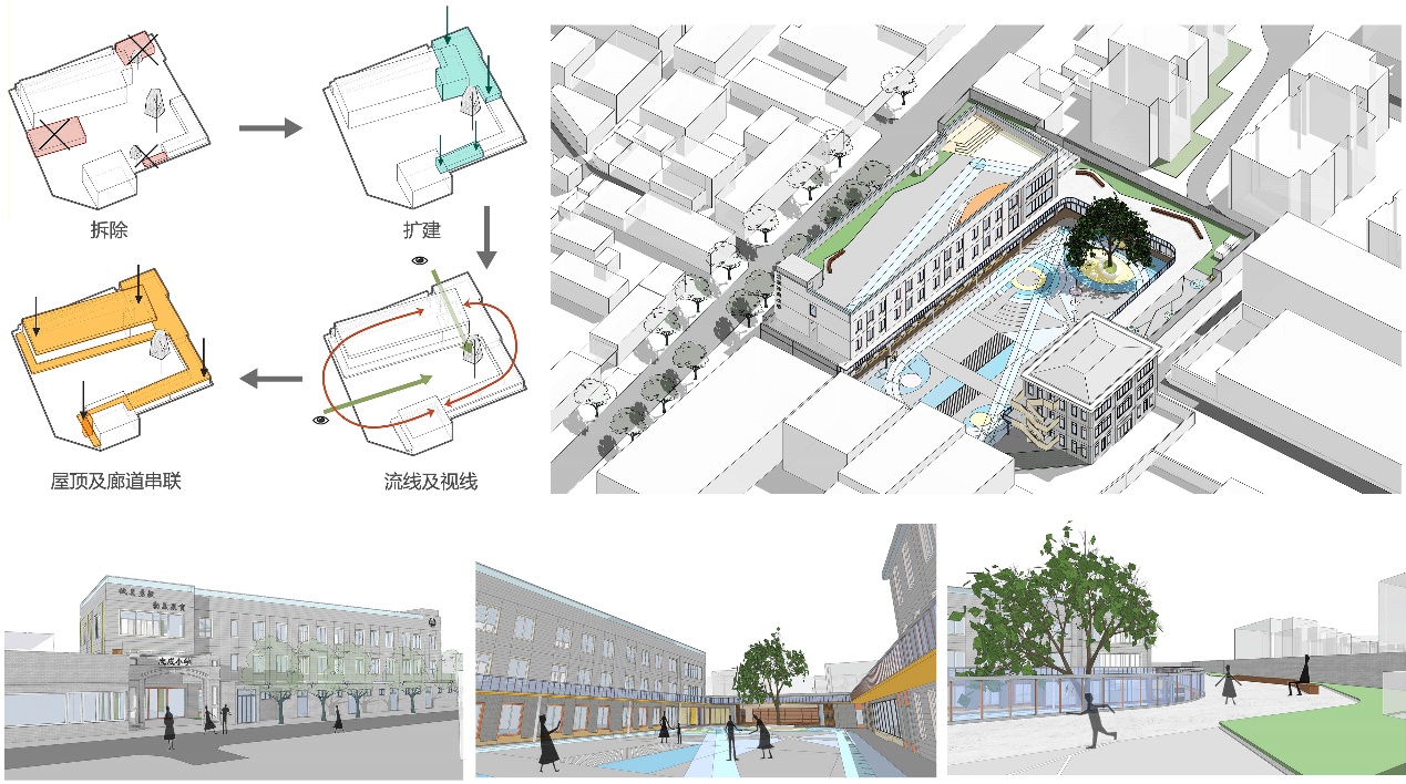 在方案设计中,遵循“整合统一、灵活变化”、“功能调整、优化升级”、“空间开放、多为发展”、“规范协调、包容突破”、“社区共享、动态可持续”的设计原则,对小学校园的布局、功能、空间、交通、非物质空间环境进行复合化改造。融合校园办学特色、自然人文环境、地域发展特点等因素,形成一个空间开放、形式多元、富有童趣和具有较高参与度的校园空间环境。